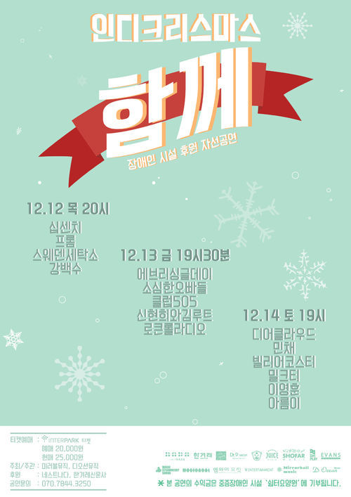 십센치, 디어클라우드 등 수많은 인디 밴드들이 다음달 12일에서 14일까지 홍대 공연장 네스트 나다에서 중증 장애인 시설 '쉼터 요양원' 돕기 자선공연 콘서트 '인디 크리스마스, 함께'를 연다.