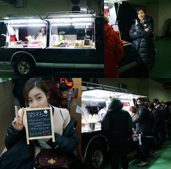 강소라는 지난 27일 저녁 추운 날씨 속에서 고생하는 스태프들을 위로하기 위해 떡볶이, 순대, 튀김 등 다양한 메뉴의 분식차를 선물해 현장 스태프들의 환호를 샀다.