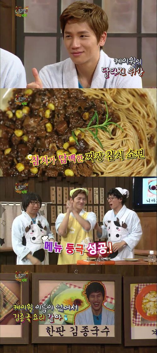 케이윌은 지난 28일 방송된 '해피투게더3' 코너 '야간매점'에서 짜장 참치를 볶은 후 옥수수와 삶은 소면을 넣은 볶음 짜장 참치면, 참짜면(참지짜장면)을 소개했다. 과거 '야간매점'에서 달걀로 국수면을 만든 '한판 김종국수'를 선보였다가 "라면 스프 안 넣은 라면"이라는 혹평을 받았던 그는 참짜면으로 불명예를 완전히 씻어냈다.