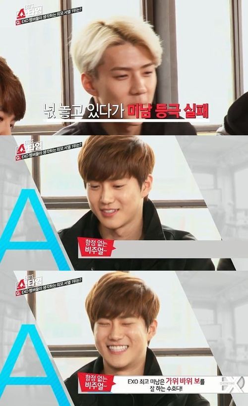 수호는 지난 28일 오후 방송된 MBC에브리원 예능프로그램 '엑소의 쇼타임'에서 세훈과 멤버들이 뽑은 외모서열 공동 1위로 뽑혀 가위바위보 대결 끝에 단독 1위가 됐다.