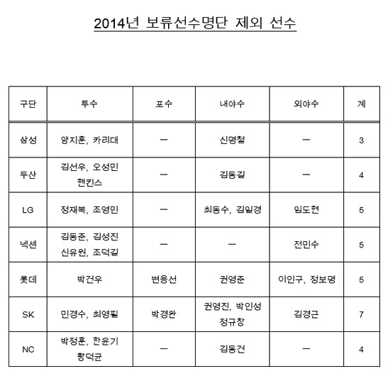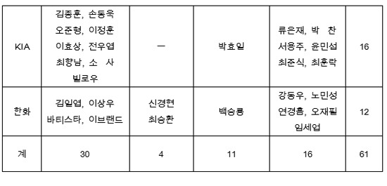 61명의 선수 모두가 원 소속팀을 떠나는 것은 아니다. KIA의 올 시즌 신인 1라운드 좌완인 손동욱의 경우는 팔꿈치 부상으로 인해 수술을 앞두고 있어 보류선수 명단 제외 후 신고선수로 재등록될 것으로 보여진다.