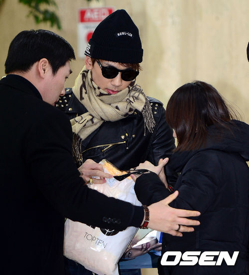 가수 비가 입국장을 나서던중 여성팬의 난입에 당황스러워하고 있다.