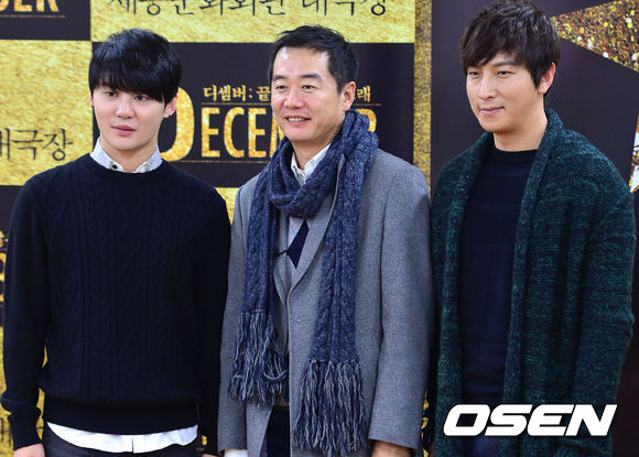 29일 오후 서울 세종로 세종문화회관 예술동 종합연습실에서 열린 뮤지컬 '디셈버: 끝나지 않는 노래'(이하 '디셈버') 연습현장공개에서 김준수와 장진 감독, 박건형이 포즈를 취하고 있다.