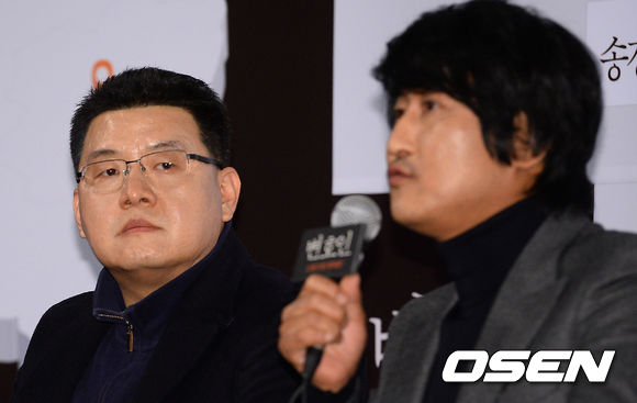 29일 오후 서울 왕십리CGV에서 진행된 영화 '변호인'(양우석 감독) 언론배급시사회에서 양우석 감독이 송강호를 바라보고 있다.