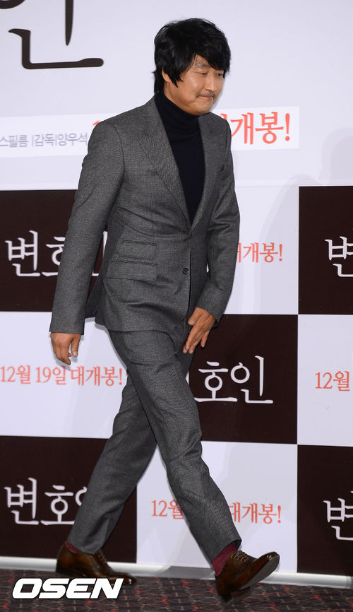 29일 오후 서울 왕십리 CGV에서 진행된 영화 '변호인'(양우석 감독) 언론배급시사회에서 송강호가 포토월을 빠져나가고 있다.