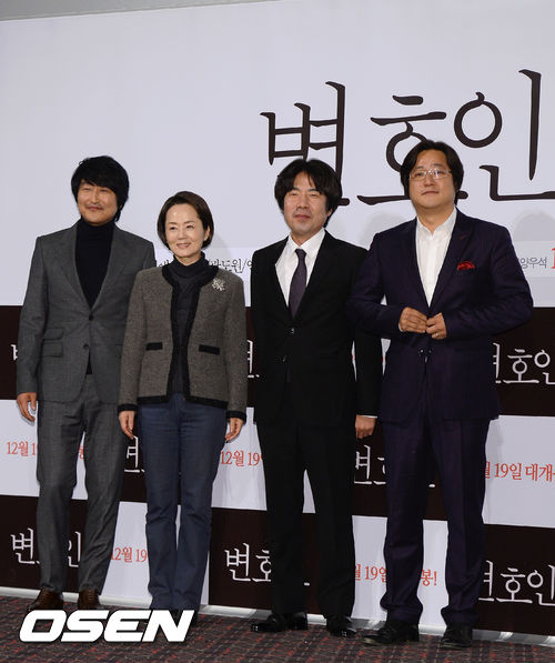 29일 오후 서울 왕십리 CGV에서 진행된 영화 '변호인'(양우석 감독) 언론배급시사회에서 송강호 김영애 오달수 곽도원이 포토타임을 갖고 있다.