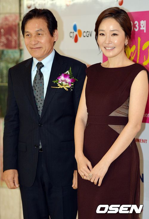 배우 엄지원과 안성기가 포토타임을 갖고 있다.