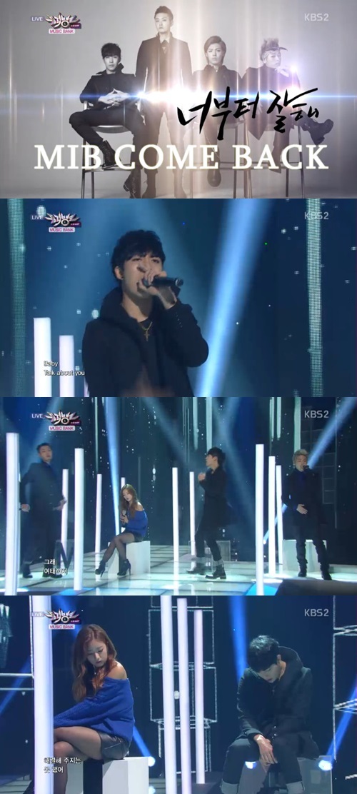 MIB는 29일 오후 방송된 KBS 2TV '뮤직뱅크'에서 신곡 '너부터 잘해'를 부르며 보미와 함께 등장해 감미로운 하모니를 들려줬다. 이들은 이별을 앞둔 연인의 쓸쓸함을 표현한 보컬과 랩으로 듣는 이의 감성을 자극했다.