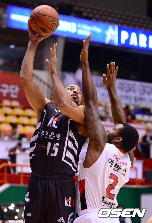 1쿼터 KT 클라크가 KGC 에반스의 슛블록을 피해 슛을 시도하고 있다.