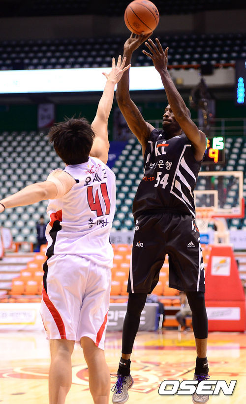 2쿼터 KT 리처드슨이 KGC 오세근의 슛블록을 피해 점프슛을 시도하고 있다.