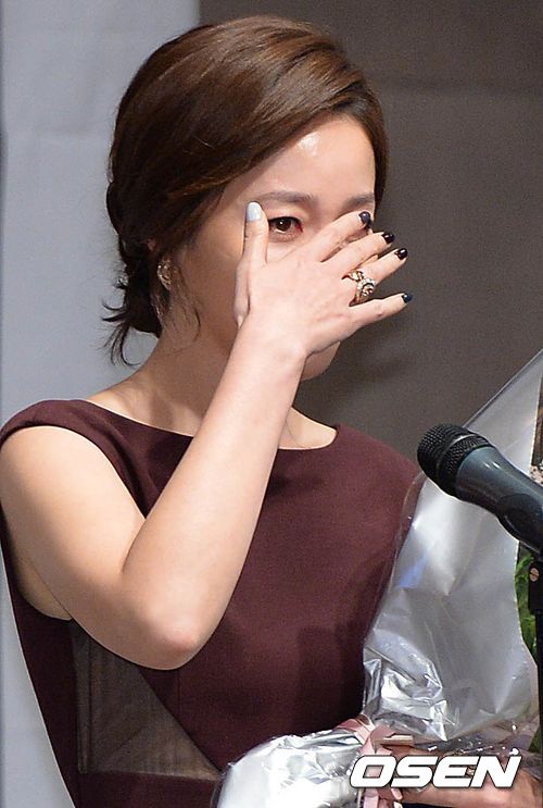 배우 엄지원이 여우주연상을 수상한 뒤 소감을 전하며 눈물을 흘리고 있다.
