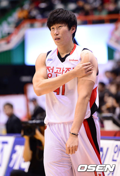 3쿼터 KGC 오세근이 KT 리처드슨과 충돌 후 고통스러워하고 있다.