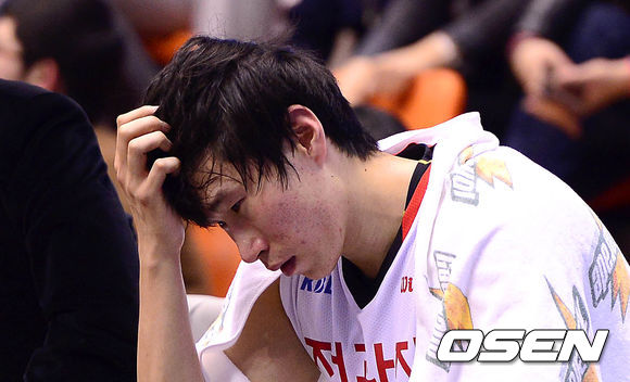 4쿼터 KGC 오세근이 벤치에서 땀을 닦고 있다.