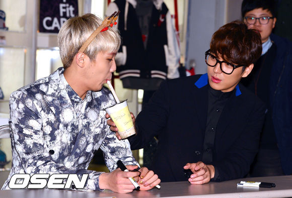 29일 오후 서울 현대백화점 목동점 별관 유라운지에서 열린 FT아일랜드 팬사인회에서 FT아일랜드 최종훈이 이홍기에게 음료를 먹여주고 있다.