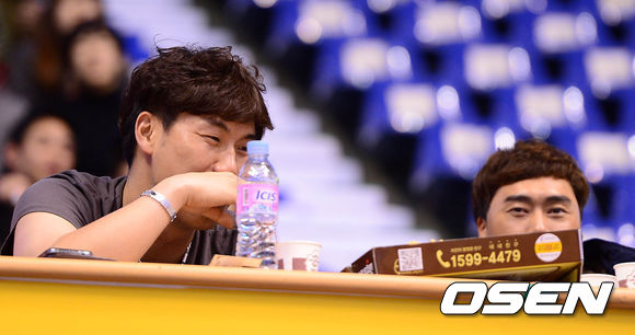 경기장을 찾은 롯데 장성호와 조성환이 관중석에서 경기를 바라보고 있다./sunday@osen.co.kr