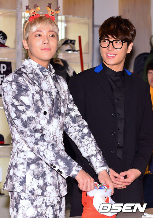 29일 오후 서울 현대백화점 목동점 별관 유라운지에서 열린 FT아일랜드 팬사인회에서 FT아일랜드 최종훈이 루돌프 머리띠를 쓴 이홍기를 바라보고 있다