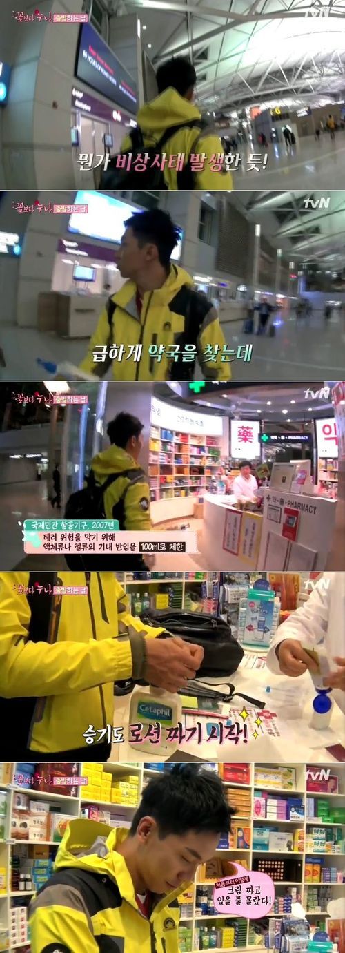 이승기가 약국을 찾은 이유는 바로 액체 용기 때문. 비행기 반입이 되지 않은 윤여정의 로션 등 용량이 큰 액체 때문에 이승기가 약국을 찾아 100미리 용기에 옮겨담아야 했던 것.