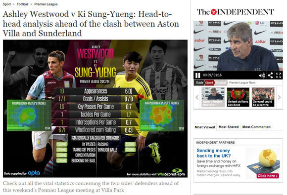 영국일간지 ‘인디펜던트’는 30일 기성용을 선덜랜드 핵심선수로 지목하며 아스톤 빌라의 미드필더 에쉴리 웨스트우드와 전격 비교했다. 두 간판선수의 활약여부에 팀의 승패가 달렸다는 의미였다. 특히 축구기록 전문사이트 ‘WhoScored.com’의 기록을 인용해 기성용의 실력을 객관적 수치로 풀어낸 점이 더 흥미를 끈다.