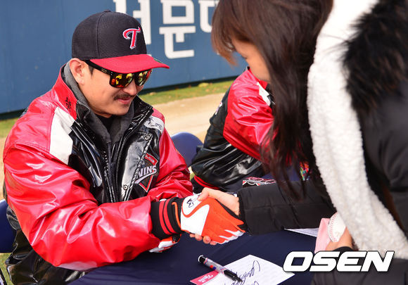 30일 오후 서울 잠실구장에서 열린 LG트윈스 러브페스티벌에서 LG 박용택이 팬과 악수를 나누고 있다.