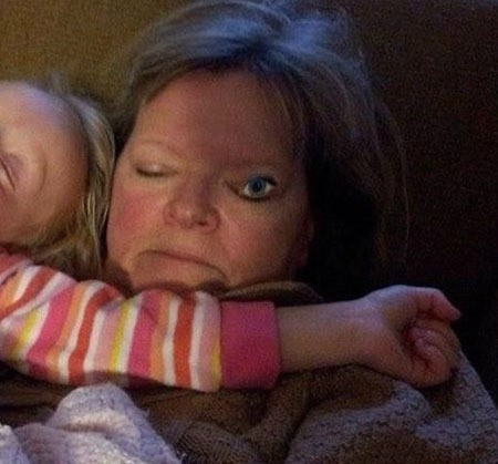 손녀가 붙인 스티커 사진 속에는 손녀를 안고 잠든 할머니가 한쪽 눈만 부릅뜨고 있어 무서움이 느껴진다.