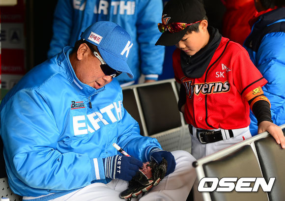 30일 오후 인천 문학구장에서 열린 '2013 한일프로야구 레전드 슈퍼게임'경기에 앞서 선동열 감독이 어린 아이에게 사인을 해주고 있다.