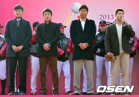 30일 오후 서울 잠실구장에서 열린 LG트윈스 러브페스티벌에서 LG로 이적한 임재철, 신승현, 이창호,'정혁진이 팬들에게 인사를 하고 있다