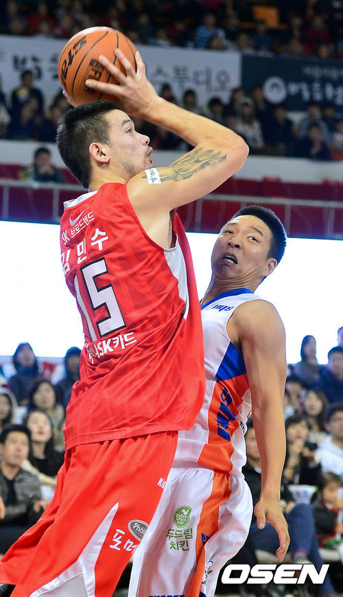 30일 오후 서울 잠실학생체육관에서 열린 'KB 국민카드 2012-2013 프로농구' 서울 SK와 인천 전자랜드의 경기, 1쿼터 SK 김민수가 골밑슛을 시도하고 있다