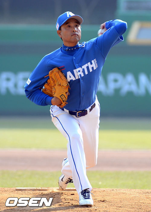 송진우는 이날 한국팀의 선발투수로 라인업에 이름을 올렸다. 프로 시절 2009년 9월 23일 대전 LG전에서 마지막 선발 등판한 뒤, 정식 경기는 아니지만 약 4년 만의 선발 나들이다.