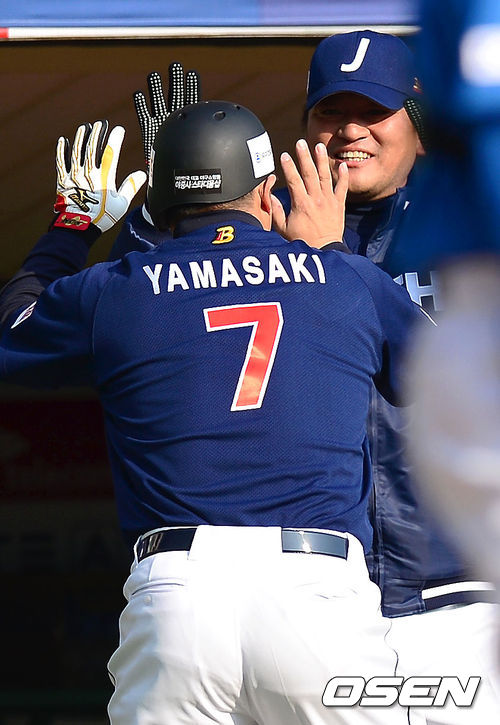 30일 오후 인천 문학구장에서 열린 '2013 한일프로야구 레전드 슈퍼게임'경기, 1회초 2사 일본 레전드 야마사키가 솔로 홈런을 때린 뒤 사사키 가즈히로 감독과 기뻐하고 있다.