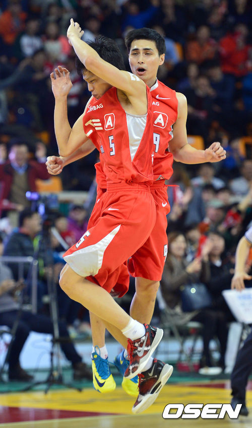 30일 오후 서울 잠실학생체육관에서 열린 'KB 국민카드 2012-2013 프로농구' 서울 SK와 인천 전자랜드의 경기,2쿼터 3점슛 3개를 성공시킨 SK 주희정이 김선형과 세레모니를 펼치고 있다.