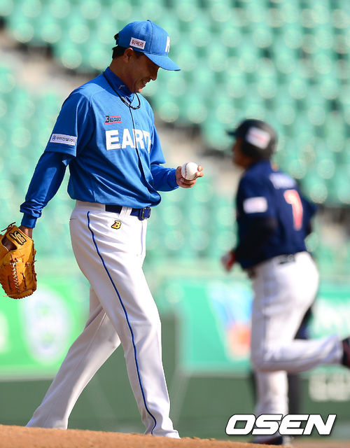 30일 오후 인천 문학구장에서 열린 '2013 한일프로야구 레전드 슈퍼게임'경기에서 1회초 2사 한국 레전드 송진우가 솔로 홈런을 허용한 뒤 씁슬해 하고 있다.