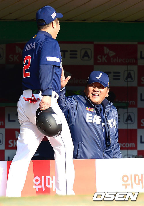 30일 오후 인천 문학구장에서 열린 '2013 한일프로야구 레전드 슈퍼게임'경기에서 3회초 일본 레전드 사사키 가즈히로 감독이 득점을 올린 이이다와 기뻐하고 있다.