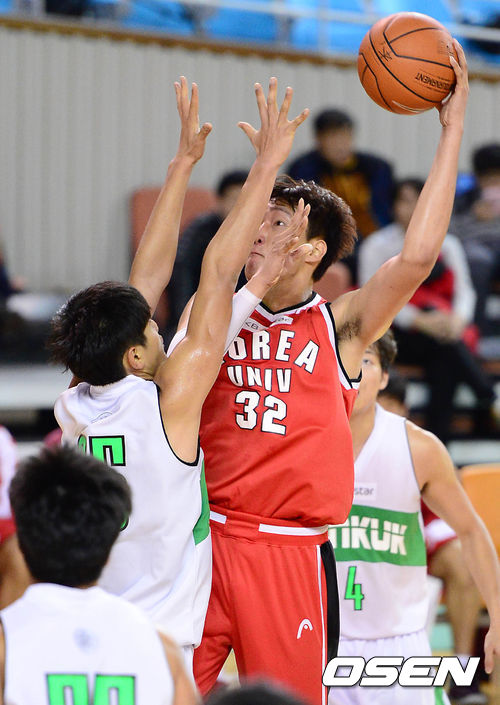 3쿼터 고려대 이종현이 건국대의 슛블록을 피해 슛을 시도하고 있다.