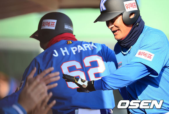 30일 오후 인천 문학구장에서 열린 '2013 한일프로야구 레전드 슈퍼게임'경기, 1회말 1사 3루 한국 레전드 이종범이 박재홍의 희생플라이로 득점을 올린 뒤 동료들과 기뻐하고 있다.