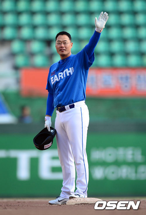 30일 오후 인천 문학구장에서 열린 '2013 한일프로야구 레전드 슈퍼게임'경기, 6회말 1사 2루 마해영이 적시타를 때린 뒤 팬들에게 인사를 하고 있다.