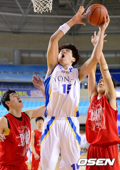 1쿼터 연세대 김준일이 리바운드에 성공하고 있다.