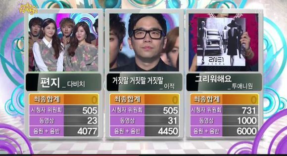 한편 이날 '쇼 음악중심'에는 미쓰에이, 이적, 효린, 트러블메이커, 윤한, FT아일랜드, 노을, 산이, 다비치, 빅스, MIB, 신지훈, 테이스티, 에이젝스, 대국남아, 히스토리 등이 출연했다.