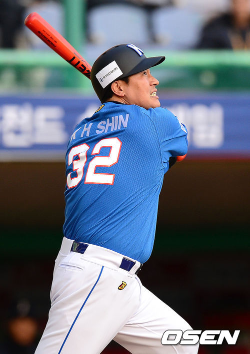 30일 오후 인천 문학구장에서 열린 '2013 한일프로야구 레전드 슈퍼게임'경기, 6회말 1사 만루 신경현이 1타점 희생플라이를 때리고 있다.