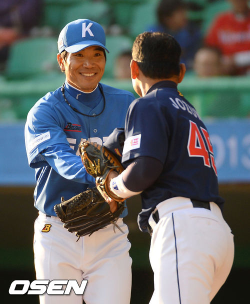 30일 오후 인천 문학구장에서 열린 '2013 한일프로야구 레전드 슈퍼게임'경기에서 한국 레전드 이대진과 일본 레전드 죠즈메가 인사를 나누고 있다.