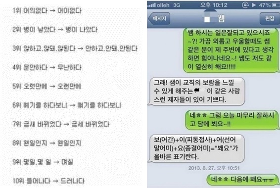 온라인 커뮤니티에 게시된 글을 보면 한 학생이 선생님과 대화를 나누다가 마지막에 “담에 뵈요”라고 문자를 보냈다. 이에 선생님은 “보(어간)+이(피동접사)+어(선어말어미)+요(종결어미)=봬요가 올바른 표기란다”라고 답변을 보내 웃음을 자아낸다.