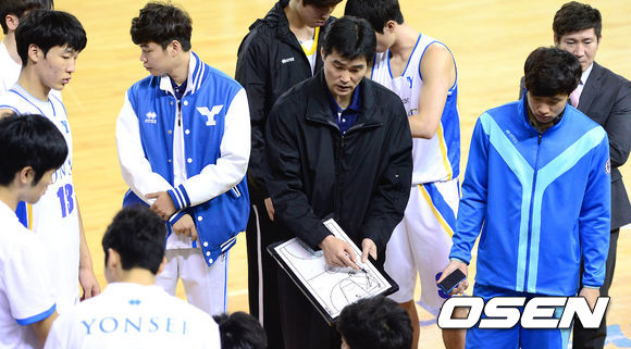 4쿼터 작전타임 때 연세대 정재근 감독이 선수들에게 작전을 지시하고 있다.