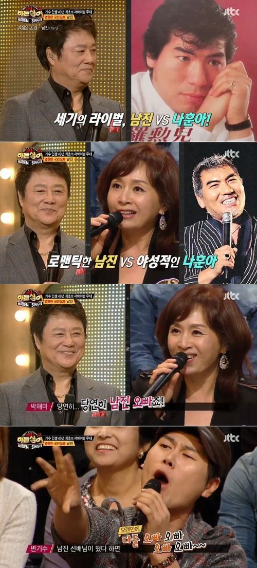 박해미는 과거 활동당시에 세기의 라이벌 구도를 형성했던 남진과 나훈아를, '로맨틱한 남진 vs 야성적인 나훈아'라고 소개한 뒤 '누가 더 좋으냐?'는 MC 전현무의 말에 "당연히 (나훈아보다는) 남진 오빠죠"라고 답했다.