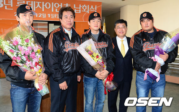 롯데에 새로 합류한 심수창, 이여상, 최준석이 김시진 감독과 최하진 대표이사와 기념촬영을 하고 있다.