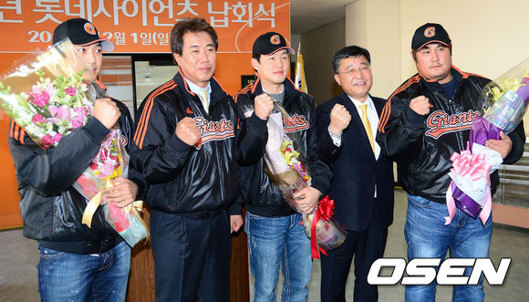 롯데에 새로 합류한 심수창, 이여상, 최준석이 김시진 감독과 최하진 대표이사와 기념촬영을 하고 있다.