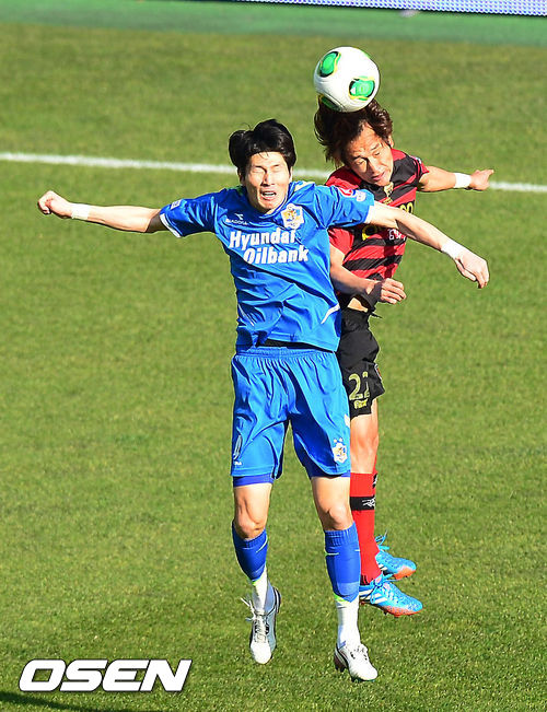 1일 오후 울산문수경기장에서 현대오일뱅크 K리그 클래식 2013 40라운드 최종전 울산 현대와 포항 스틸러스의 경기, 전반 울산 강민수와 포항 노병준이 공중볼 다툼을 하고 있다.
