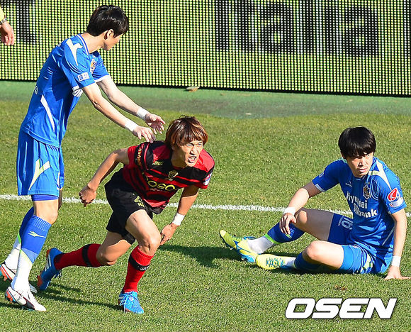 1일 오후 울산문수경기장에서 현대오일뱅크 K리그 클래식 2013 40라운드 최종전 울산 현대와 포항 스틸러스의 경기, 전반 울산 강민수가 포항 노병준의 플레이에 의해 김성환이 넘어지자 강민수가 노병준을 밀고 있다.