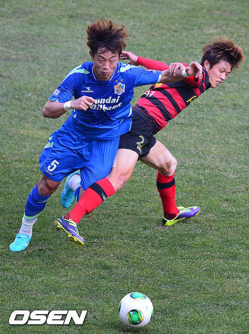 1일 오후 울산문수경기장에서 현대오일뱅크 K리그 클래식 2013 40라운드 최종전 울산 현대와 포항 스틸러스의 경기, 울산 최보경이 포항 김승대에게 걸려 넘어지고 있다.