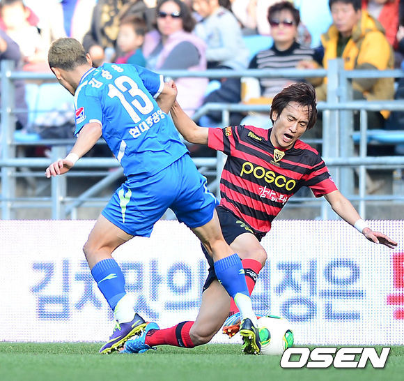 1일 오후 울산문수경기장에서 현대오일뱅크 K리그 클래식 2013 40라운드 최종전 울산 현대와 포항 스틸러스의 경기, 전반 포항 노병준이 울산 김승용에 태클을 시도하고 있다.