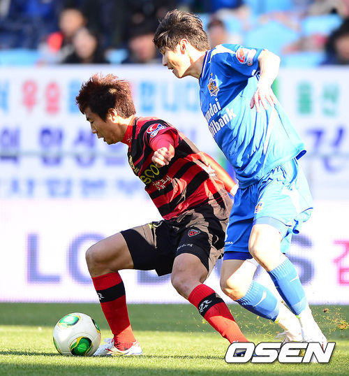1일 오후 울산문수경기장에서 현대오일뱅크 K리그 클래식 2013 40라운드 최종전 울산 현대와 포항 스틸러스의 경기, 전반 양팀 선수들이 포항 문전에서 볼다툼을 하고 있다.