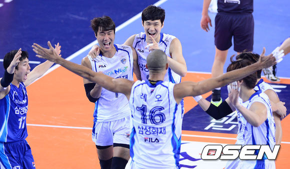 1일 오후 천안 유관순체육관에서 열린 '2013-2014 NH농협 V리그' 남자부 현대캐피탈과 삼성화재의 경기 1세트 삼성화재 선수들이 득점 후 기뻐하고 있다.